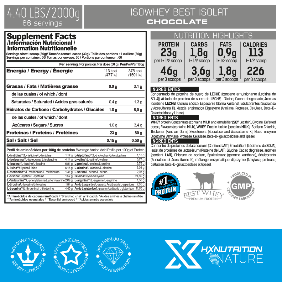 ISO WHEY de HX Nature es una proteína en polvo de alta calidad diseñada para favorecer la recuperación muscular, mejorar el rendimiento deportivo y ayudar a mantener o aumentar la masa magra. Su fórmula avanzada combina un aislado de proteína de suero de rápida absorción con el complejo enzimático DigeZyme®, que facilita la digestión y maximiza la asimilación de nutrientes.
