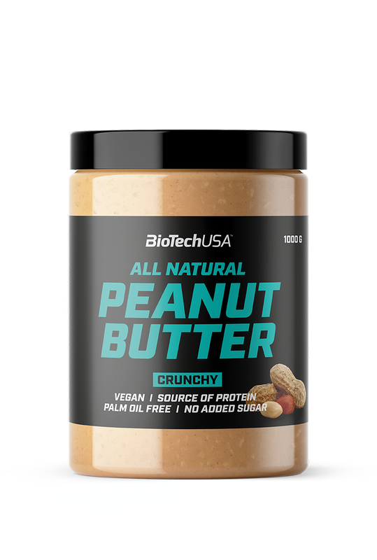 Peanut Butter BioTechUSA es una mantequilla de cacahuete 100% natural, elaborada exclusivamente con ingredientes de origen vegetal. Rica en fibra, fuente de proteína y disponible en dos deliciosas versiones: Creamy (smooth) para quienes prefieren una textura suave y fácil de untar, y Crunchy para los amantes del toque crujiente.